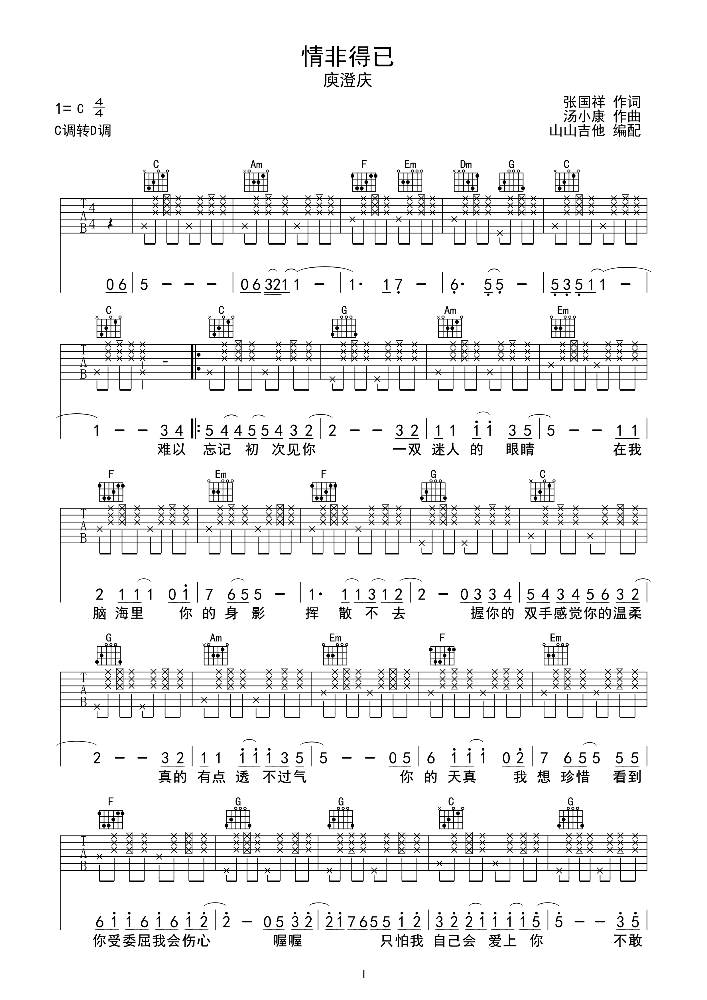 情非得已-庾澄庆 c调拍弦版编配c调六线吉他谱-虫虫吉他谱免费下载