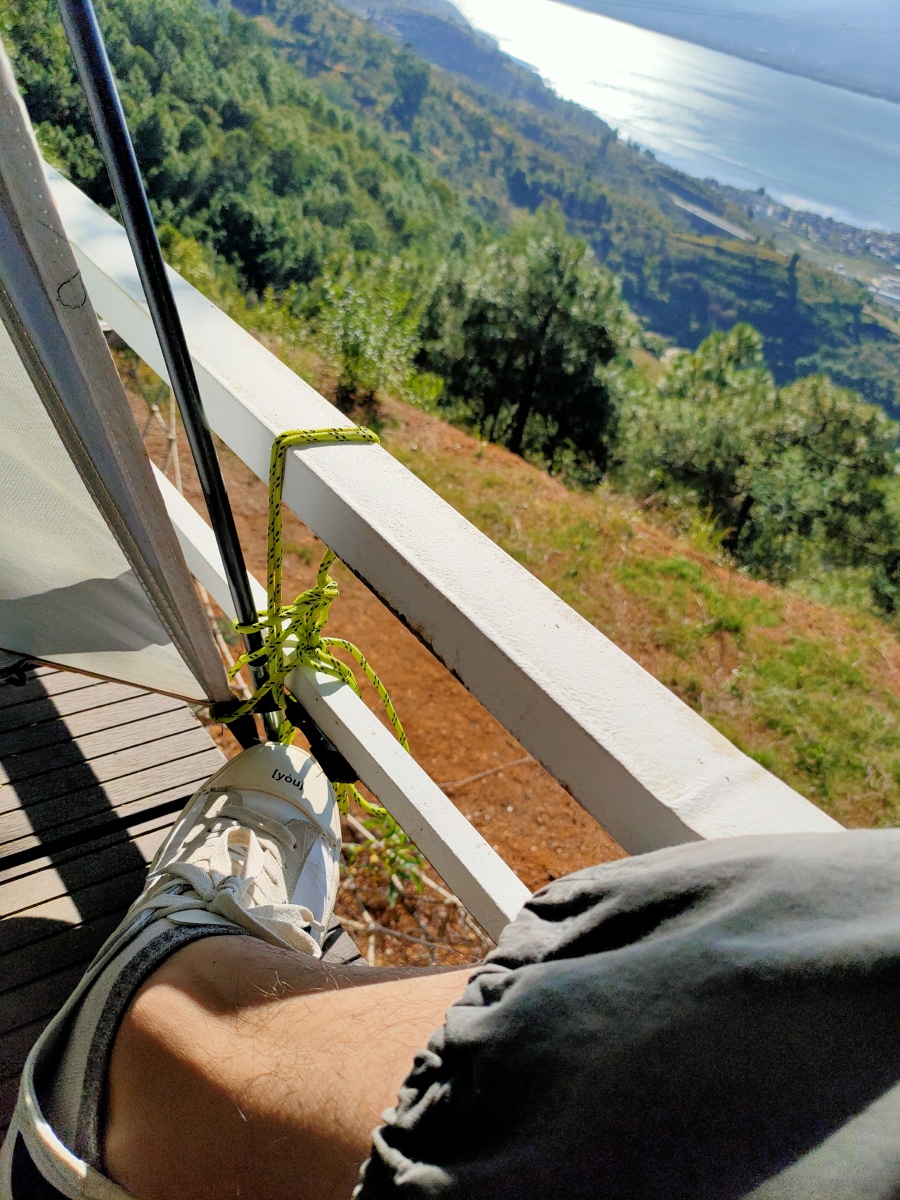 一个穿着灰色运动服的年轻人在森林里的树上晒太阳.