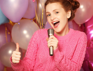 在演播室对着麦克风唱歌的女孩