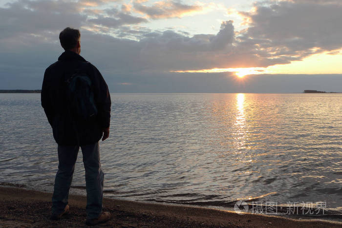 男人站在河岸边在日落