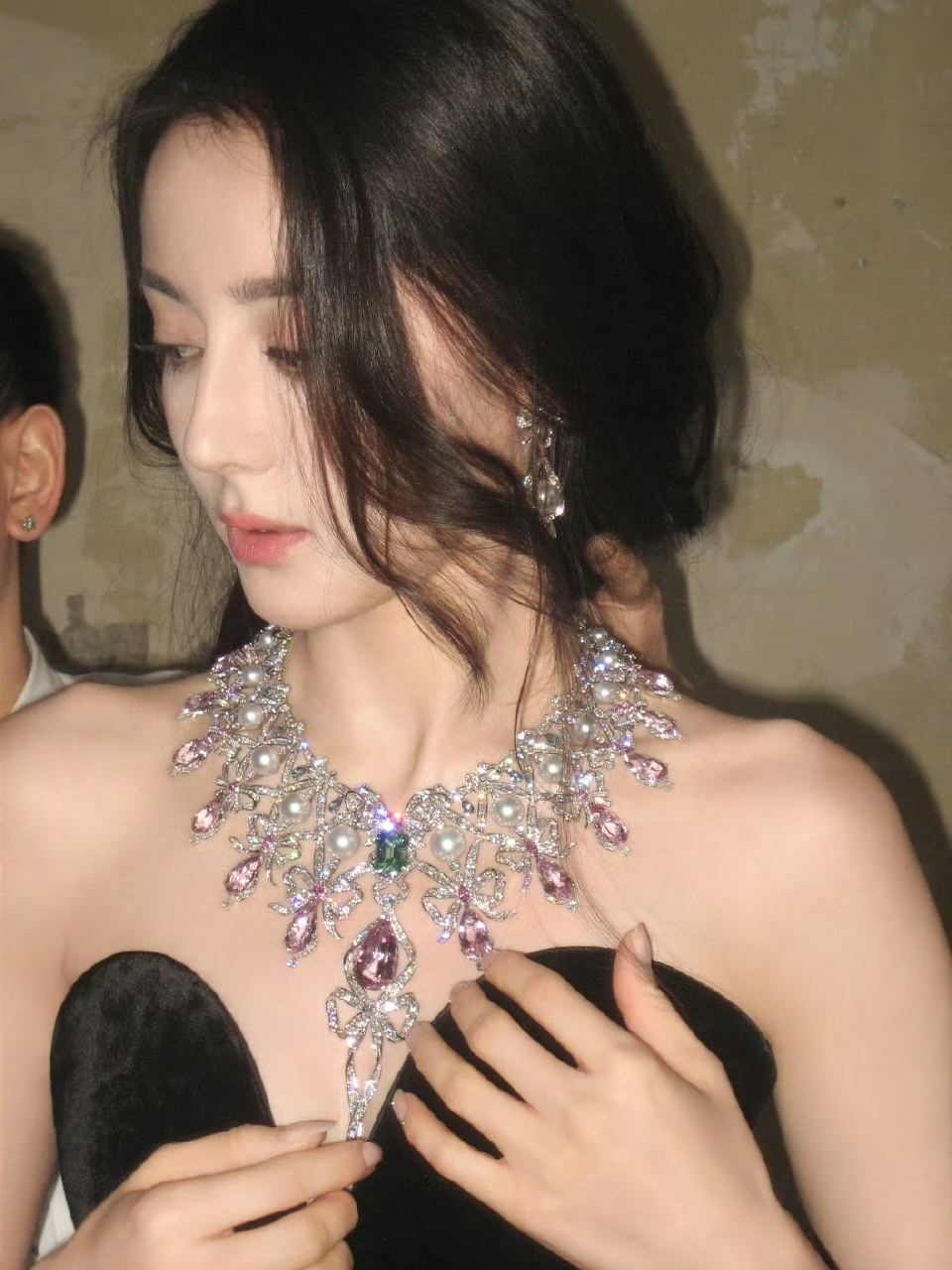 迪丽热巴身着黑色深v抹胸礼服,气场全开