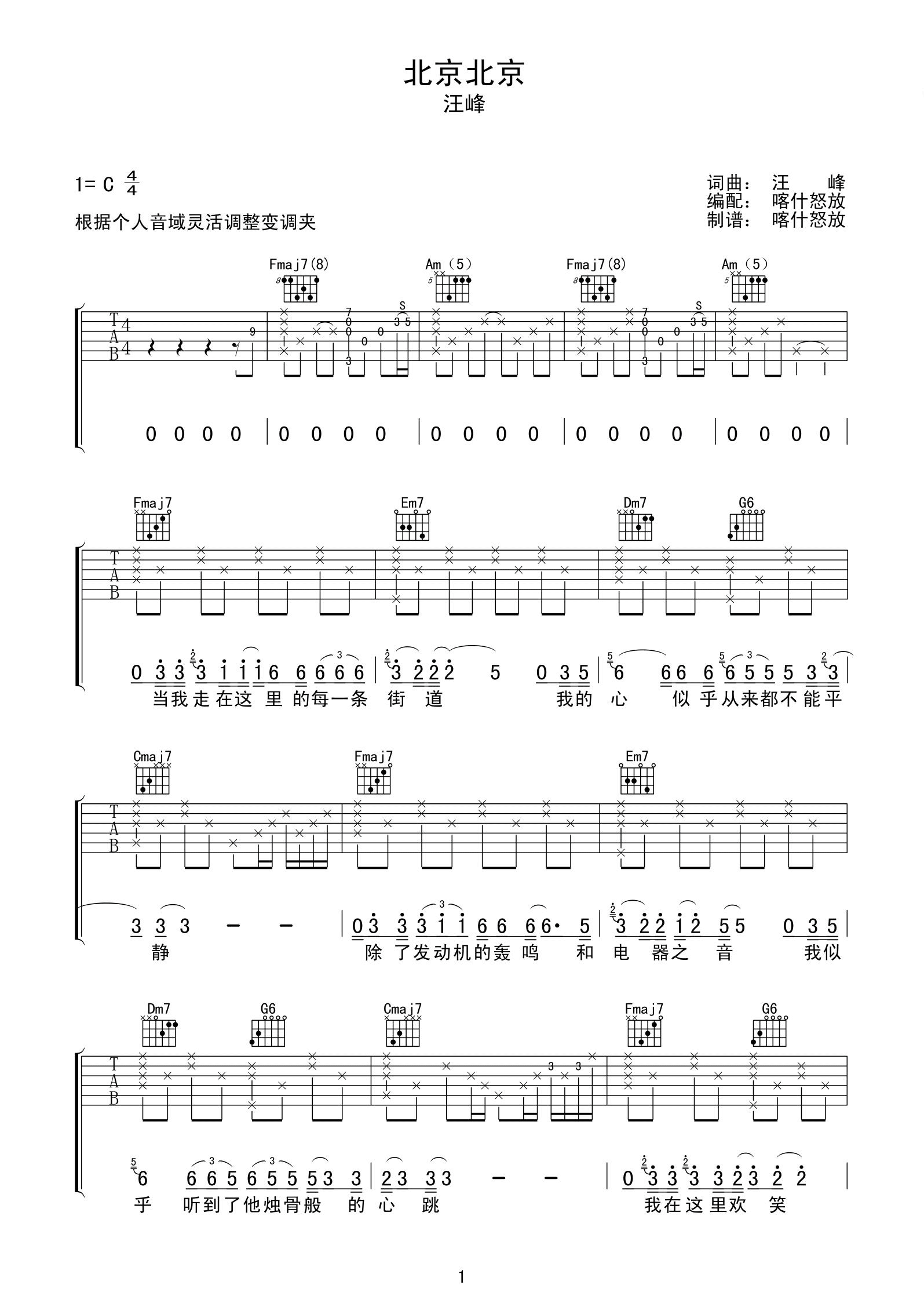 汪峰 北京北京 c调_吉他谱_17吉他网