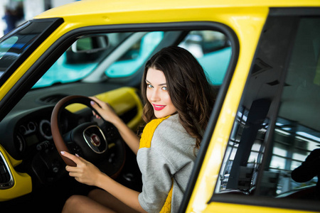 美丽的微笑女人开车黄色,有魅力的女孩坐在汽车,肖像照片