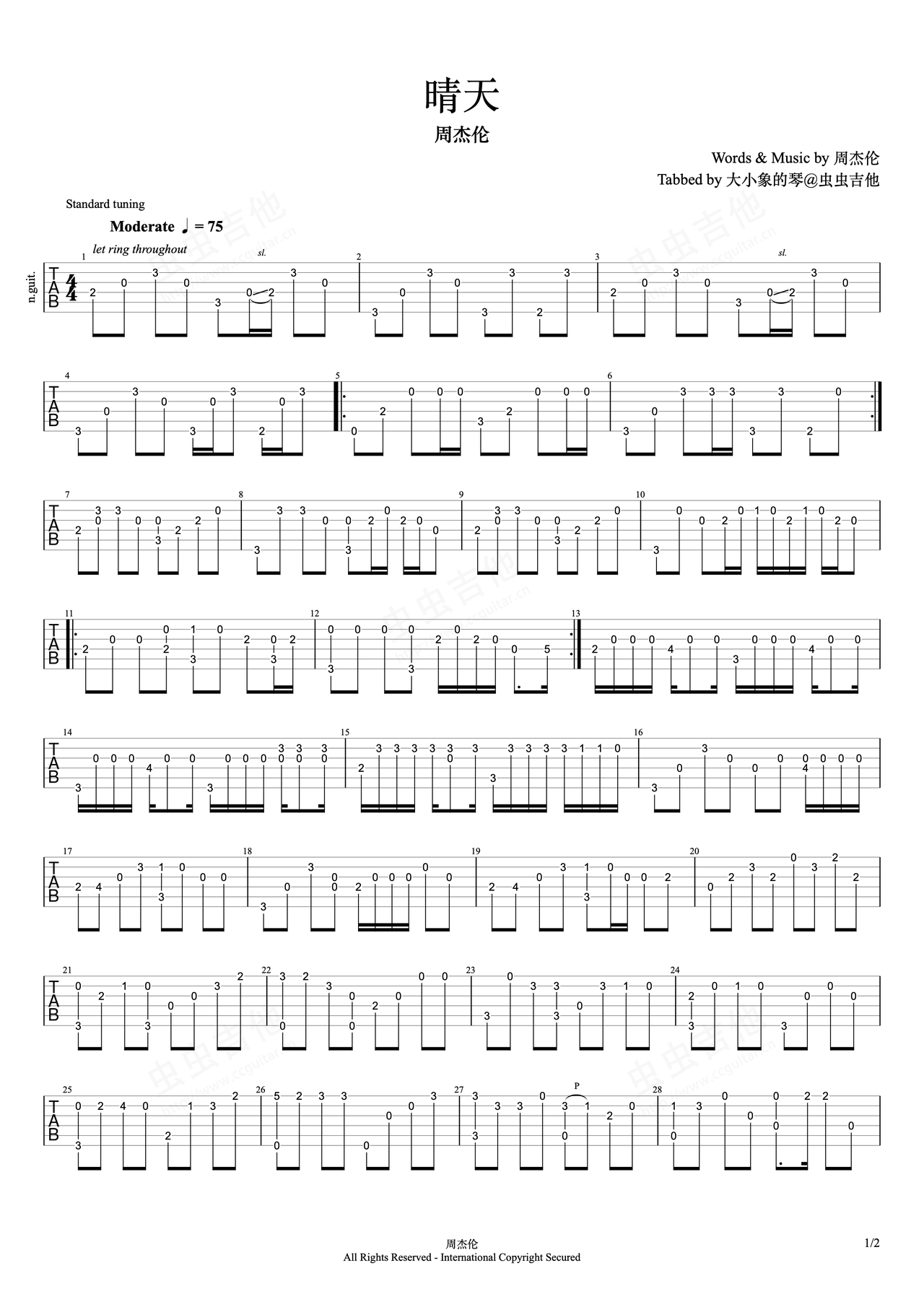 晴天吉他谱-指弹谱-g调-虫虫吉他