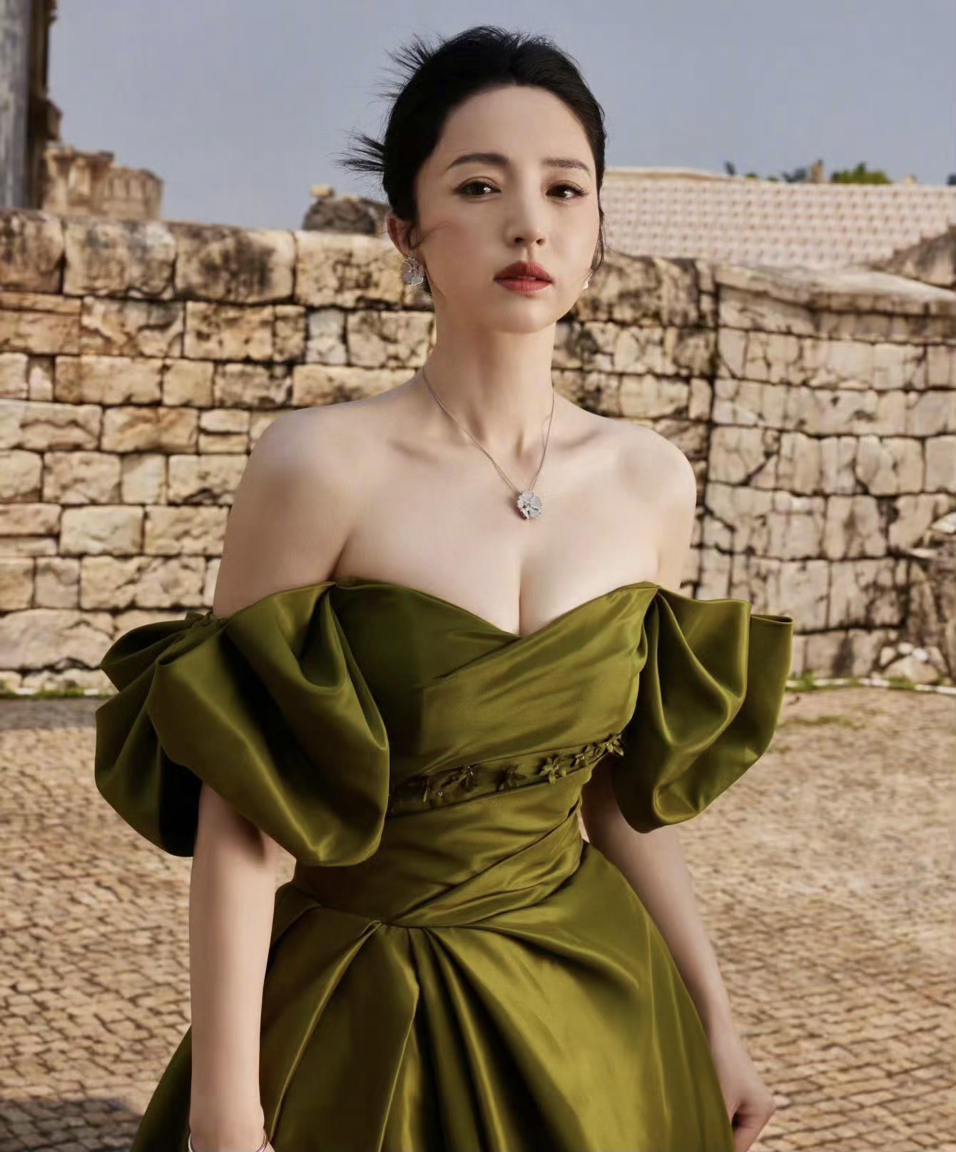 董璇绿色露肩长礼服气质优雅韵味十足