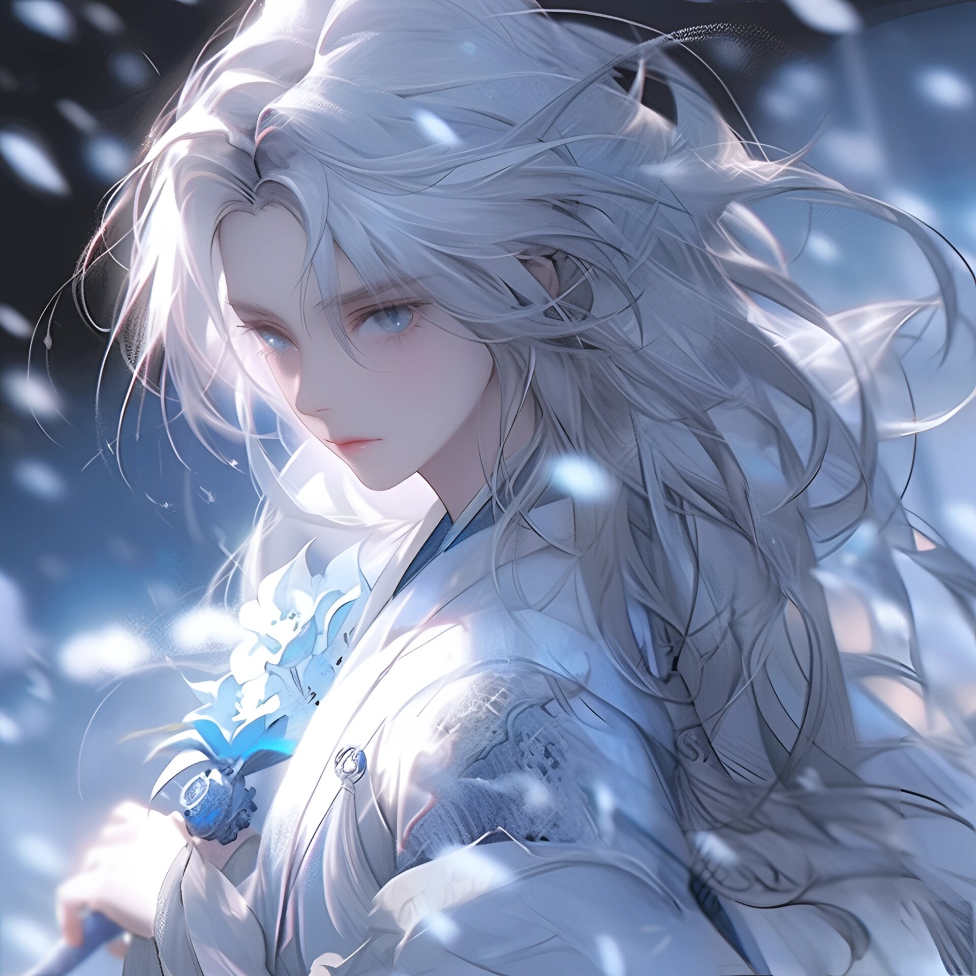 大雪纷飞,戴着蓝色丝绸眼带的蓝发古风精致玄女仙女唯美高清桌面壁纸