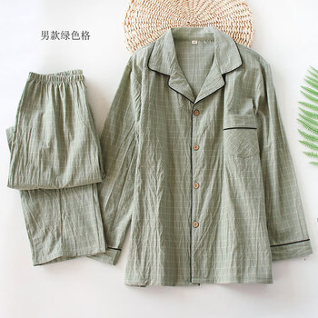 日式无印纯色睡衣女良品全棉双层纱家居服无侧缝睡衣春秋款男长袖