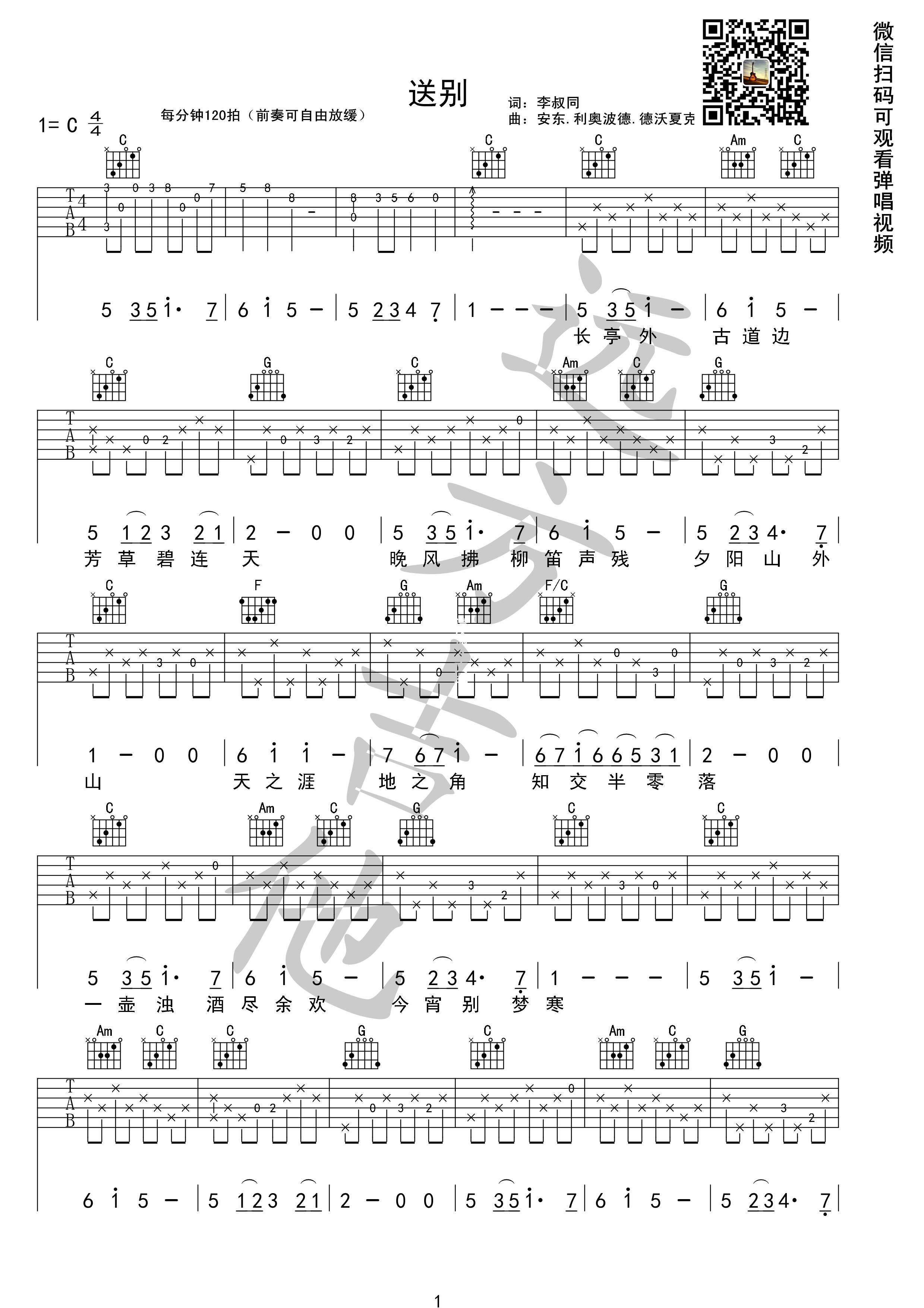 送别吉他谱(图片谱,简单版,单音版)_群星(various artists)_送别(单音