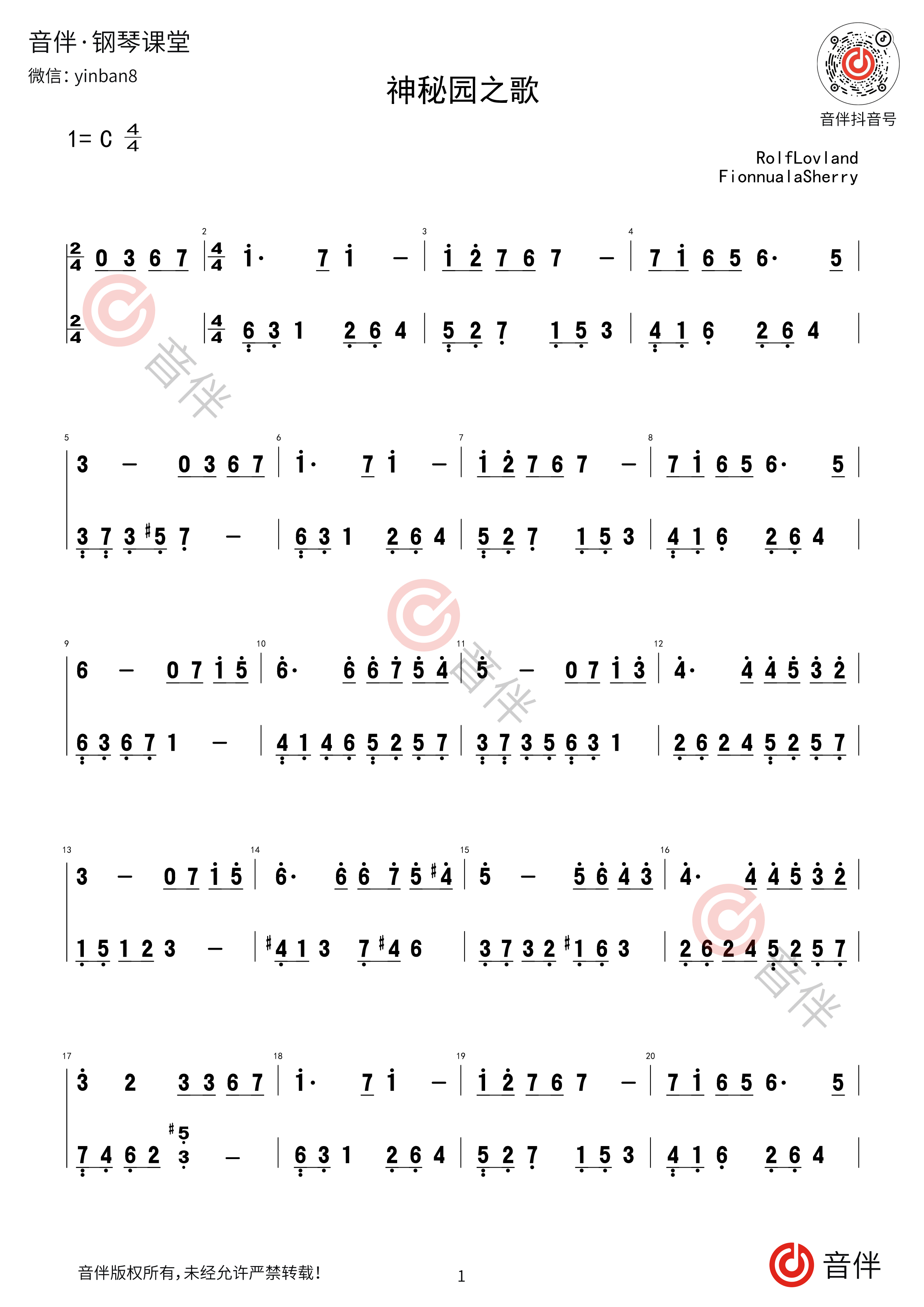 神秘园之歌钢琴简谱c调简单版视频教学