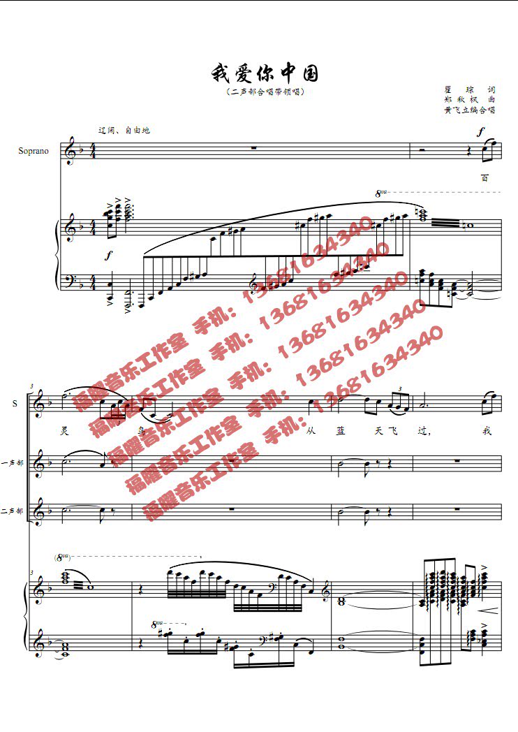 黄飞立 我爱你中国 二声部领唱与合唱简谱f调钢琴五线谱正谱