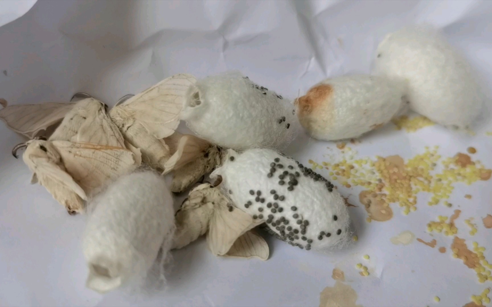 有几只蚕蛾钻出来了,它们就要开始产卵啦,明年又可以继续养蚕喽