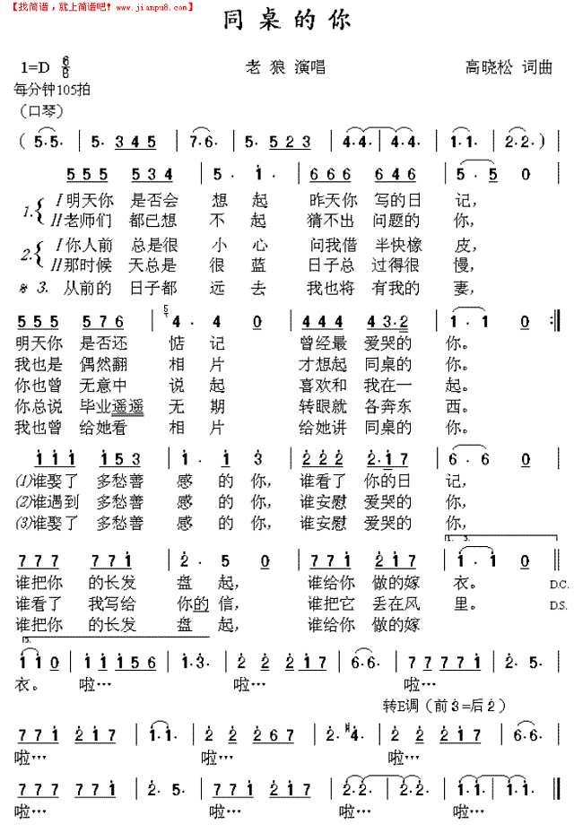 同桌的你 老狼 钢琴谱 钢琴双手简谱