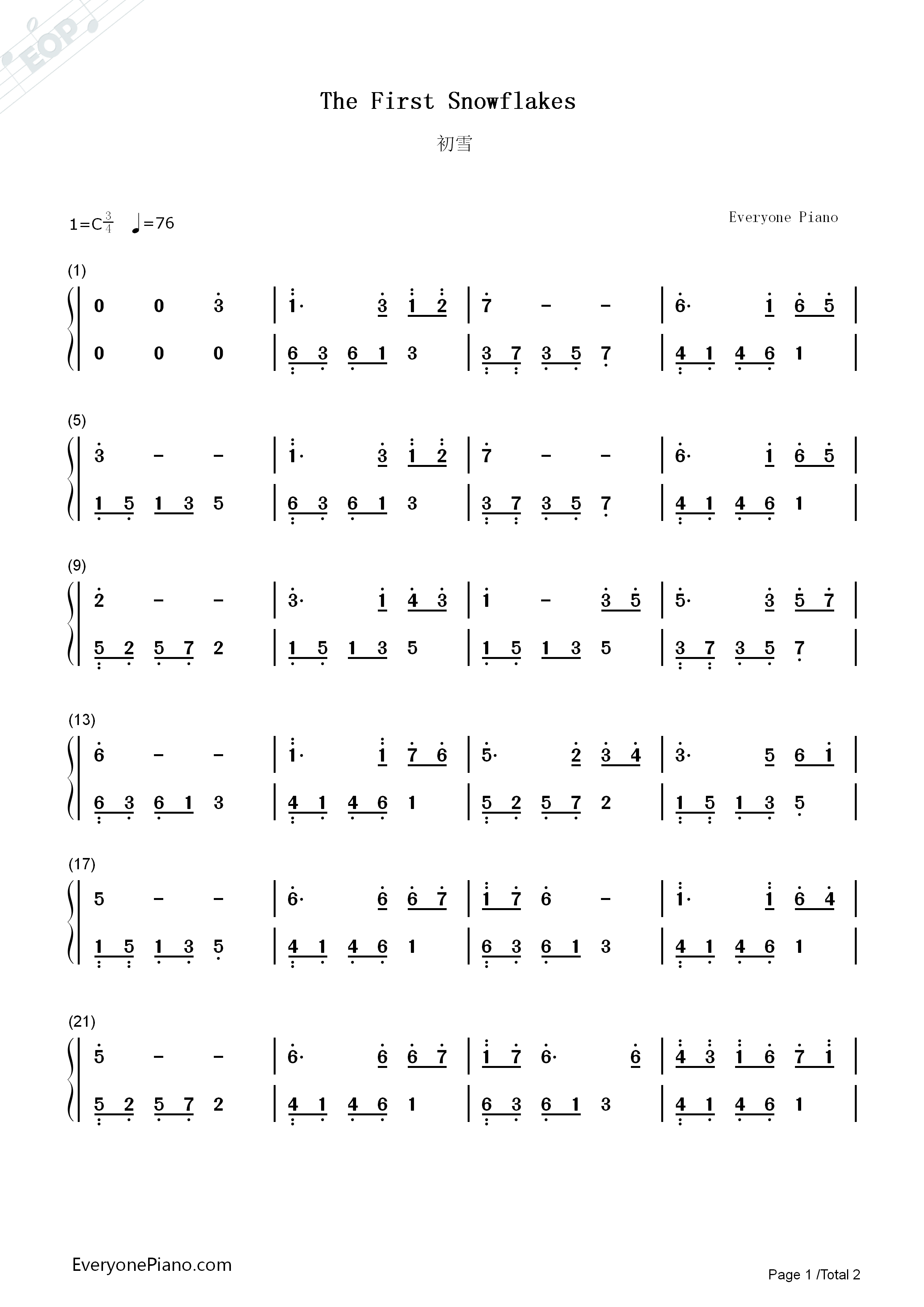 初雪好听简单版eop教学曲双手简谱预览1