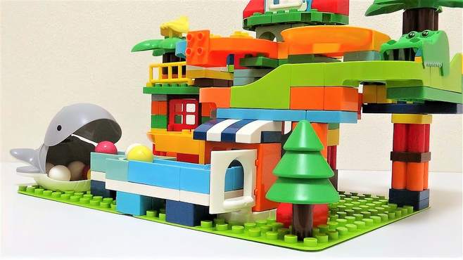 超多彩色积木做游乐园和超级轨道,弹珠跑出来,没有玩具车一起玩