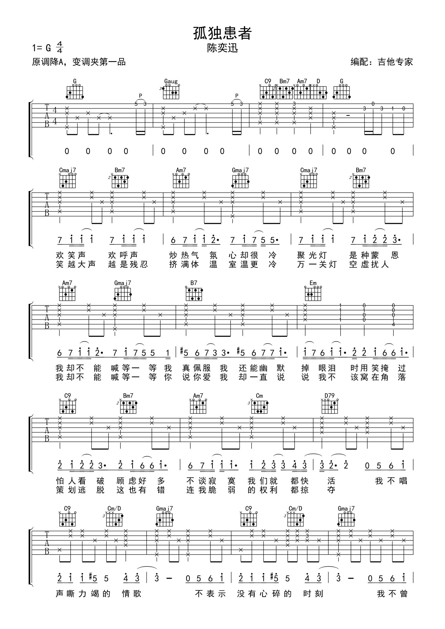孤独患者吉他谱_g调_陈奕迅_原版弹唱谱_高清六线谱1