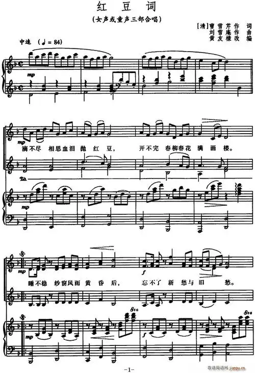 《红豆词》降g调五线谱简谱 《红豆词》的歌词选自文学巨著《红楼梦》