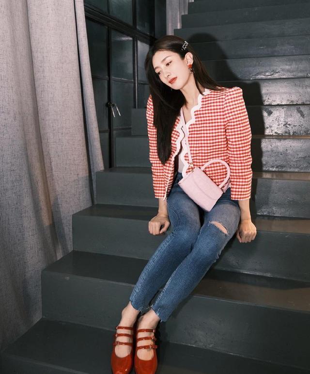 "冷白皮"的江疏影穿红色套装配紧身牛仔裤 真时髦