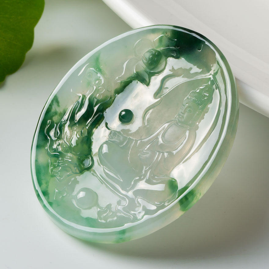 省级玉雕大师李光权作品 翡翠冰种飘蓝花观音挂件 19.06g xn59