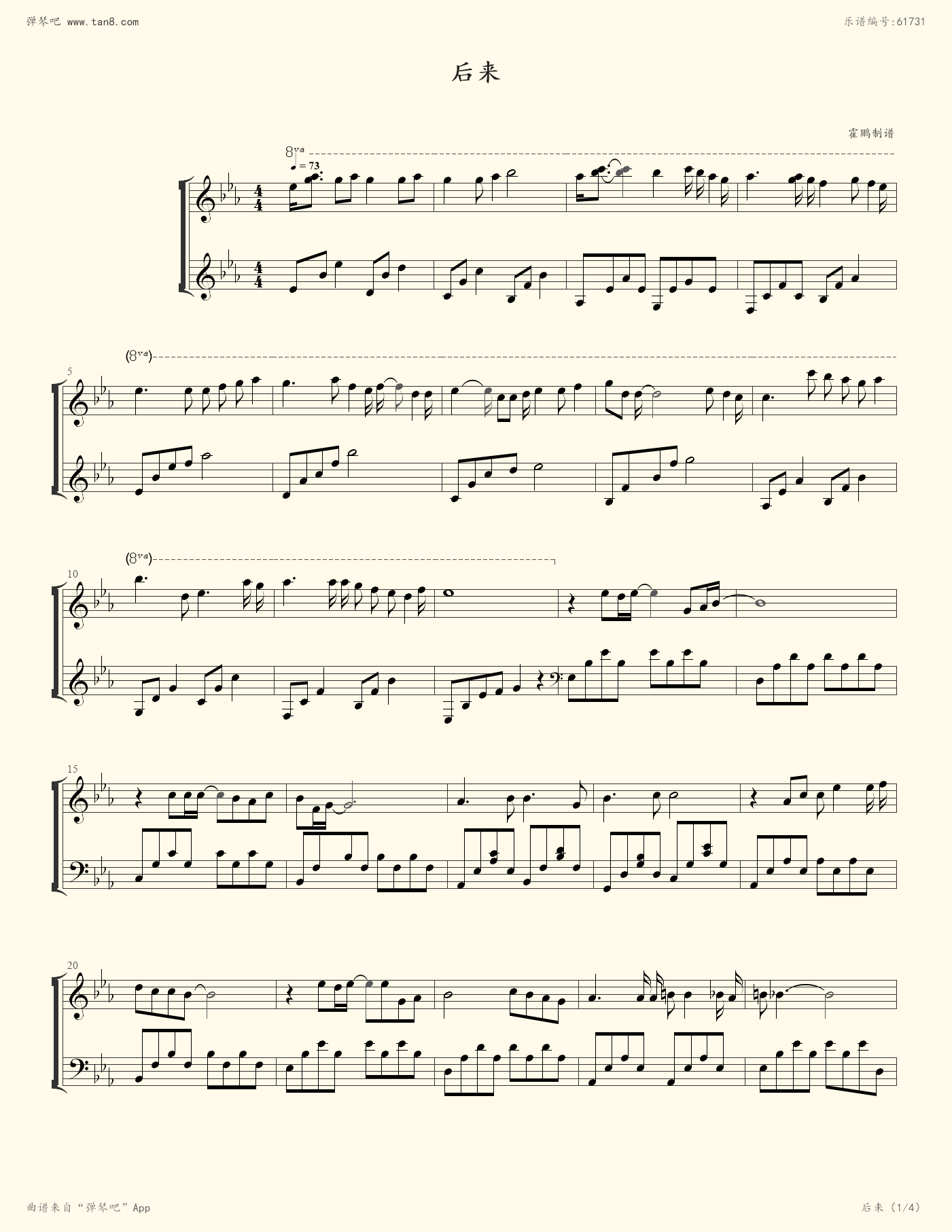 钢琴谱:后来(悠悠琴韵)