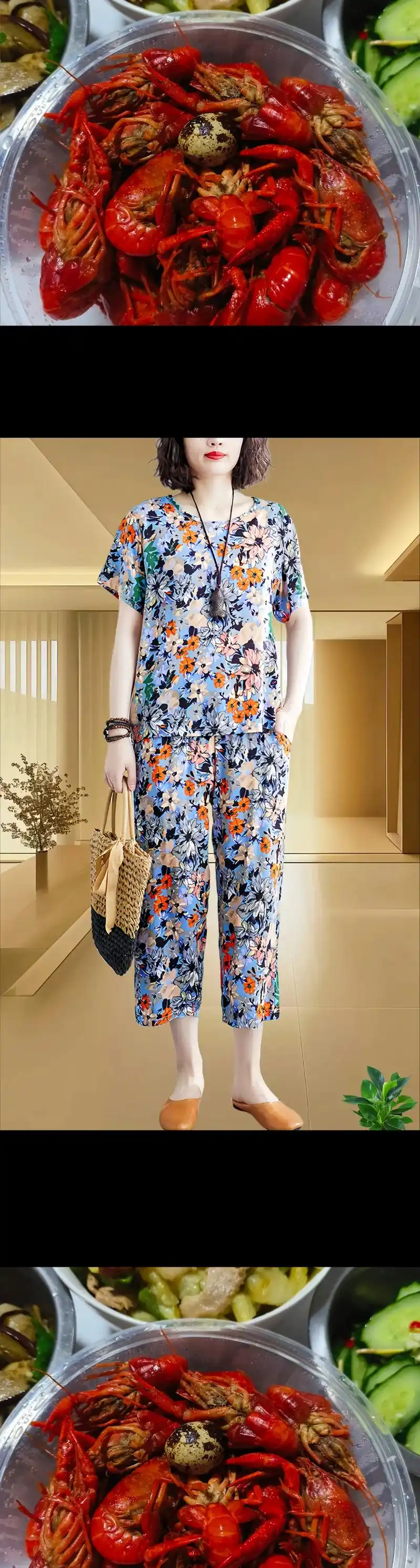 件套时尚阔腿七分上衣印花棉绸短袖外穿两洋气时尚套装