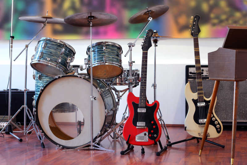 乐器, 拍摄在一个舞台上准备现场音乐会的摇滚乐队照片