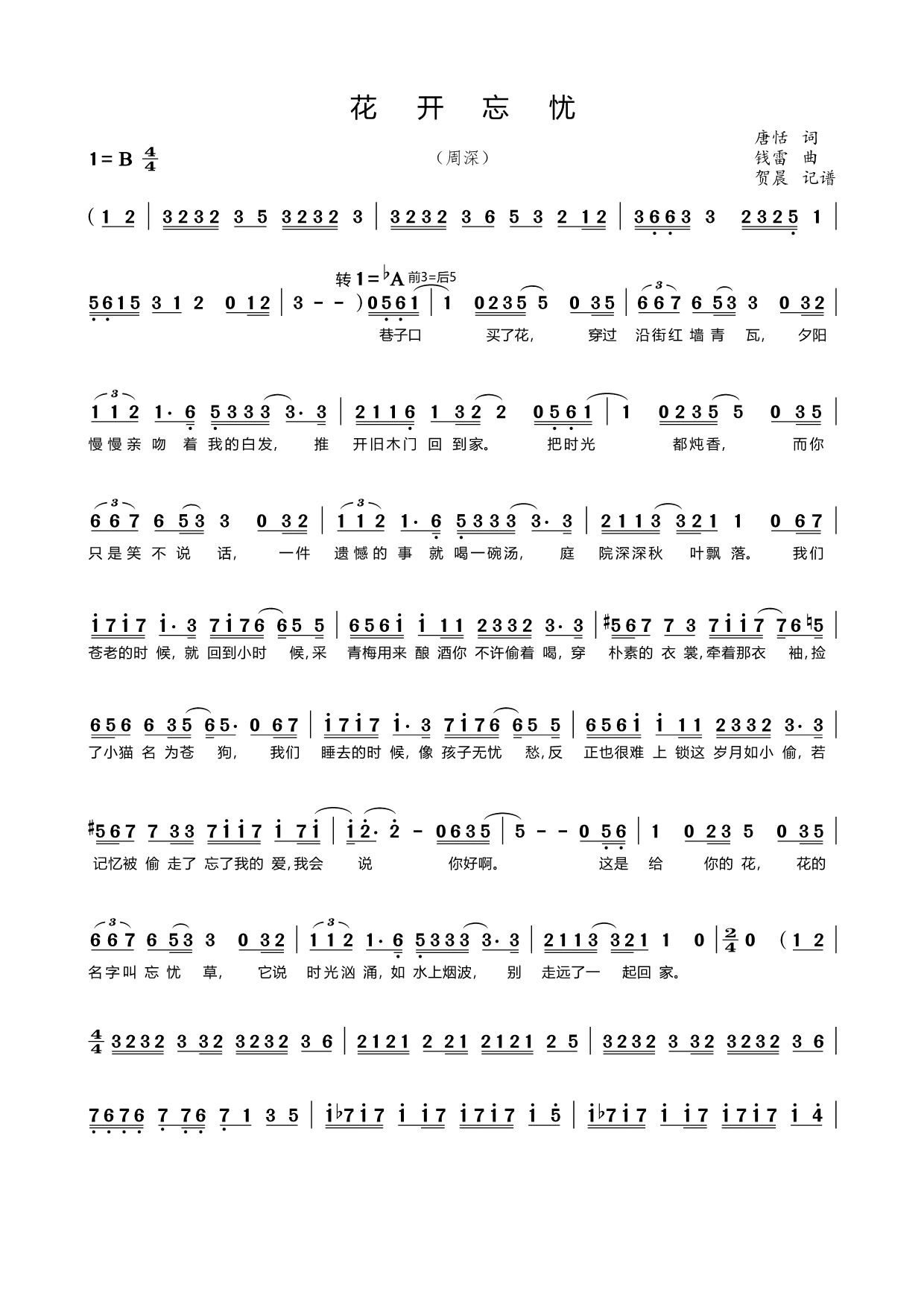 花开忘忧周深,乐谱 花开忘忧周深,乐谱