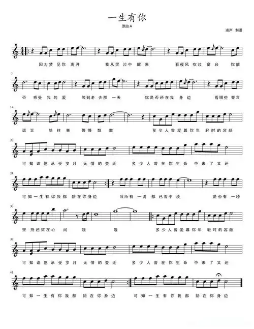一生有你-水木年华五线谱预览1-钢琴谱文件(五线谱,双手简谱,数字谱