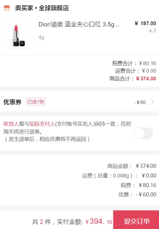 dior 迪奥 蓝金夹心口红 3.5g *2件