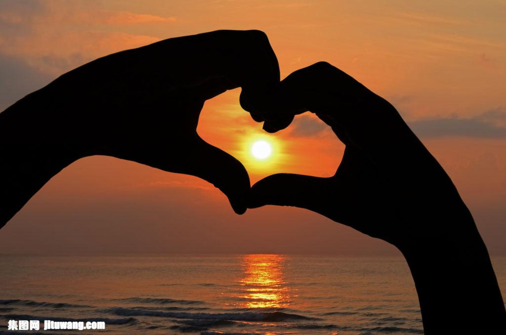 夕阳与爱心手势图