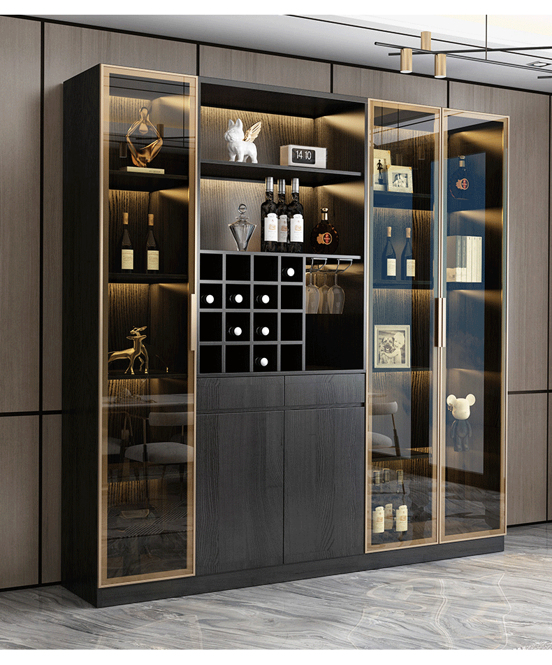 玻璃酒柜靠墙客厅酒柜现代简约餐边柜酒柜一体轻奢酒柜收藏柜黑色八门