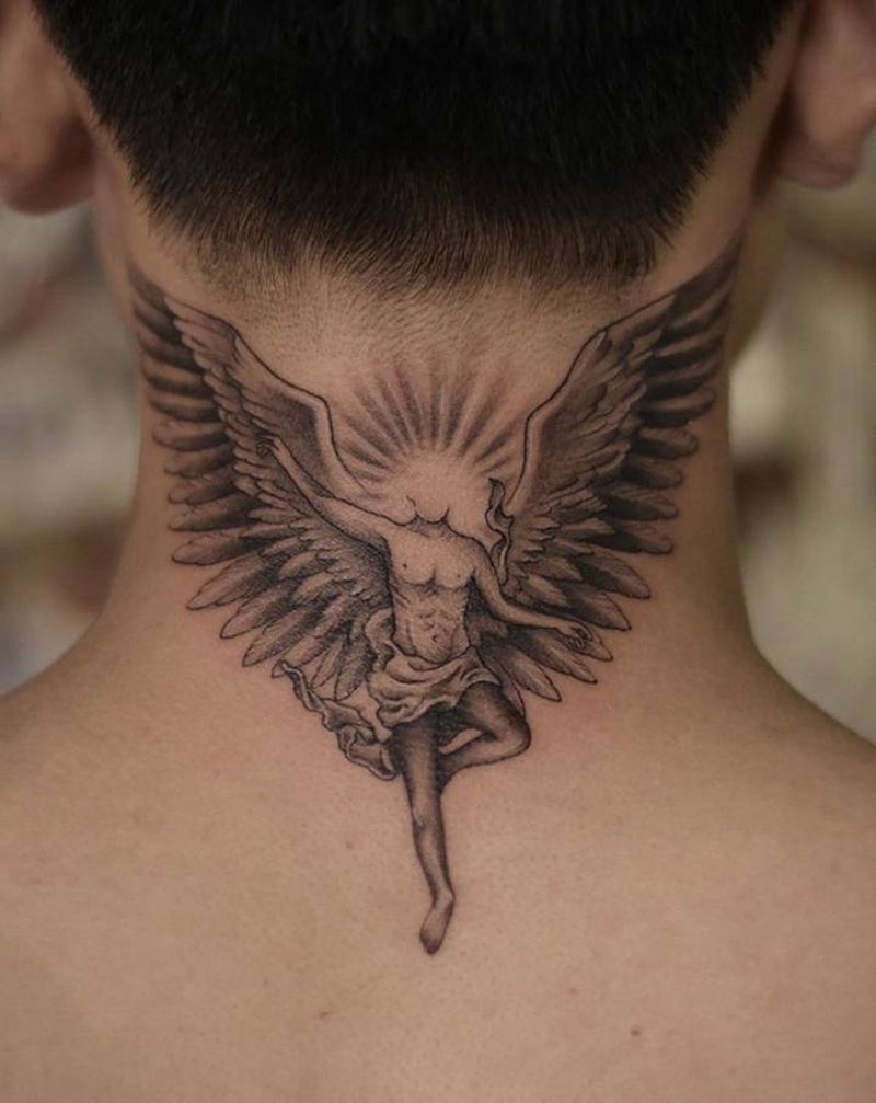 权志龙gd同款天使纹身图片_颈部欧美写实点刺纹身图案