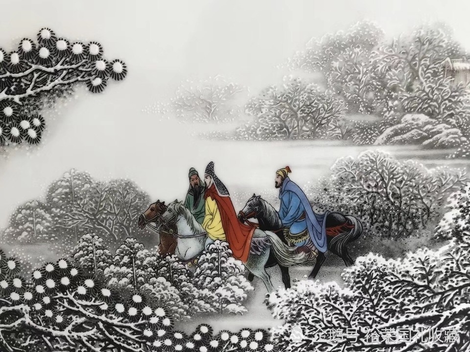 张松茂大师手绘瓷板画三顾茅庐《风雪访贤》,景德镇作品