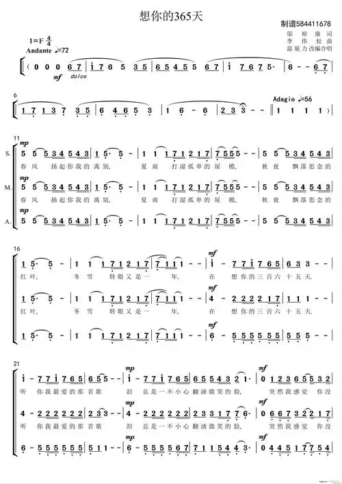 想你的365天合唱谱(三部合唱) 歌谱简谱网