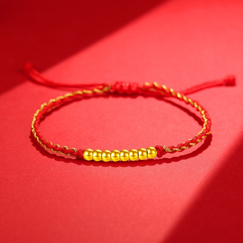 老庙硬足金八福临门八金珠红绳手绳黄金手链