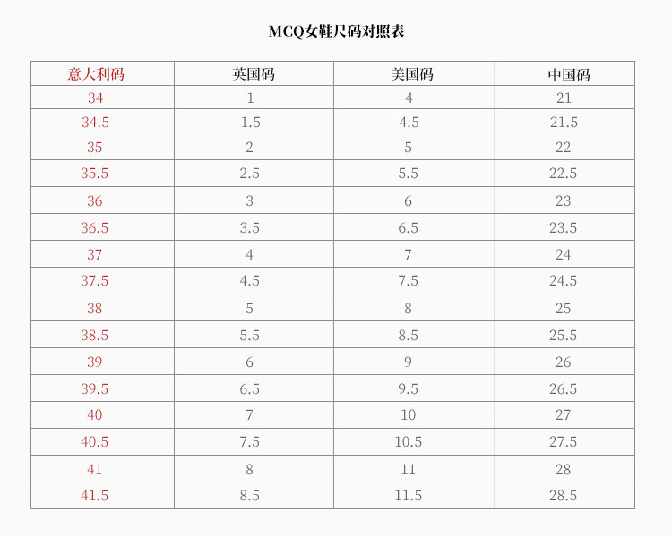 鞋子尺码对照表