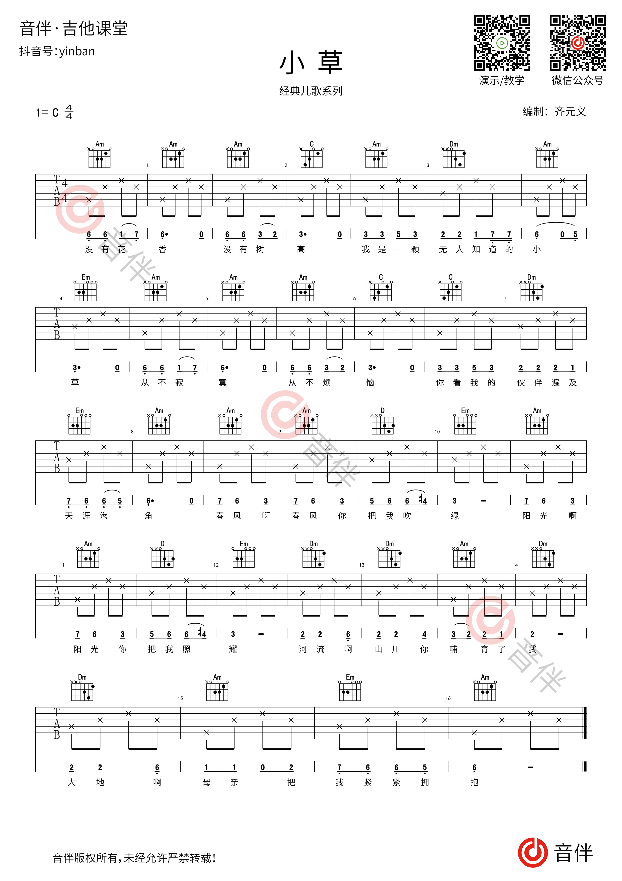 小草吉他谱 c调六线谱-齐元义编配-王祖皆1
