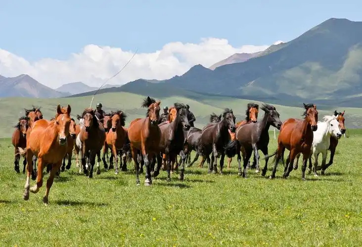 绿草如茵的草原上,牧马人放牧途中扬鞭催马,奔跑的马群现万马奔腾美景
