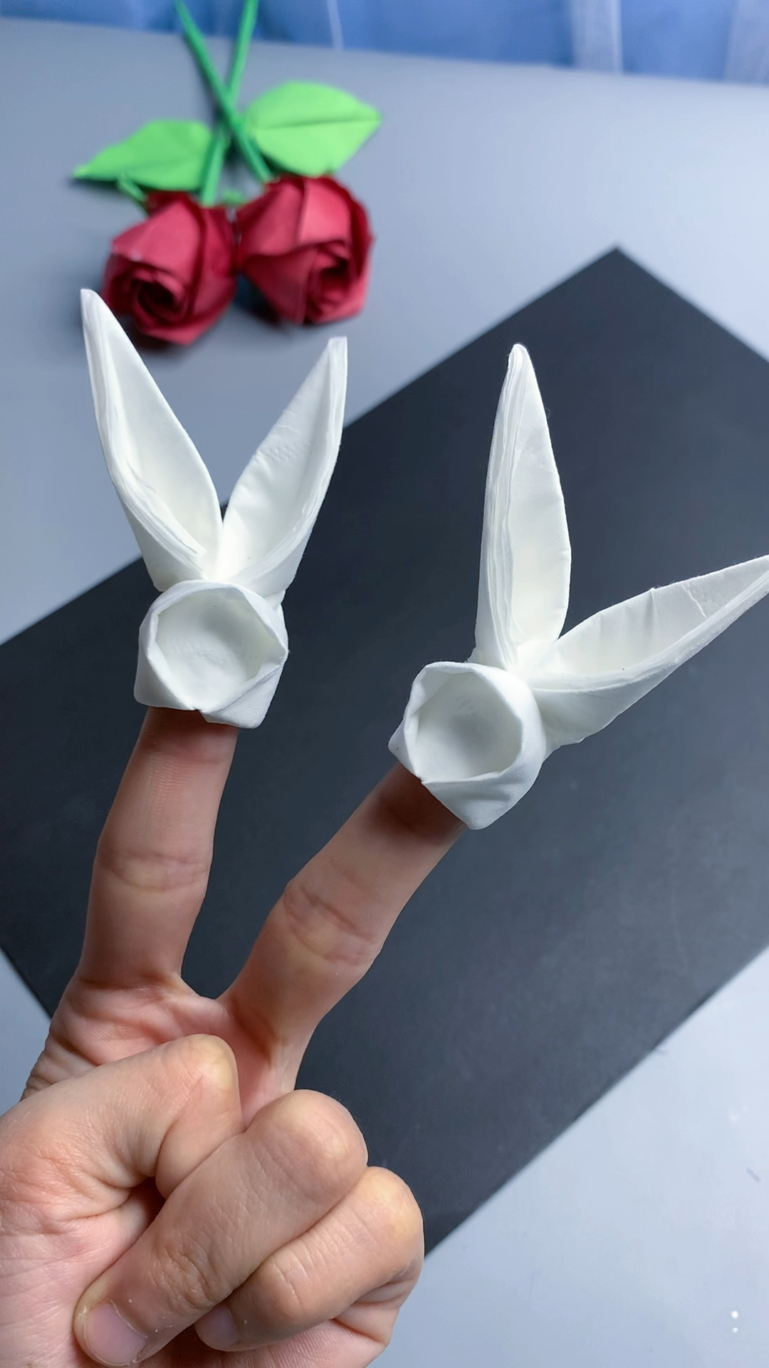 用纸巾折一个可爱的小兔子,还可以套在手上哦