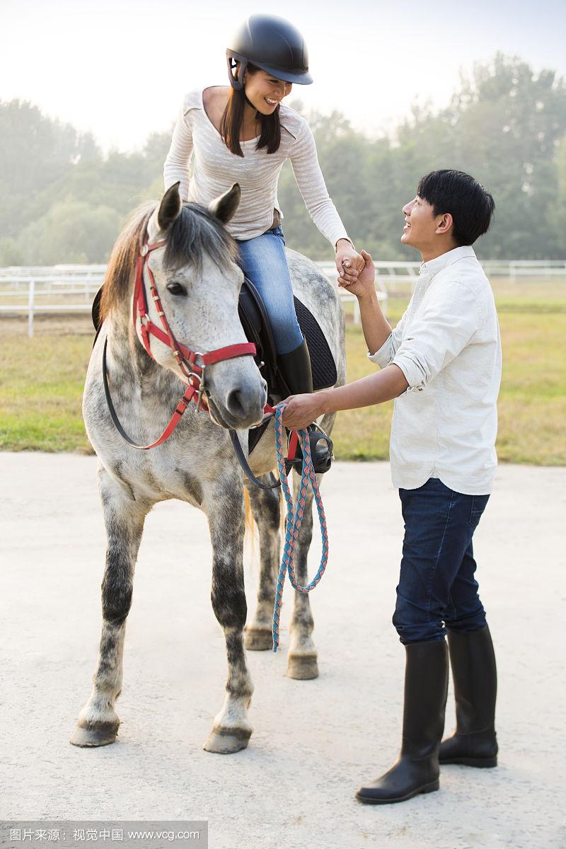 年轻情侣在马场骑马