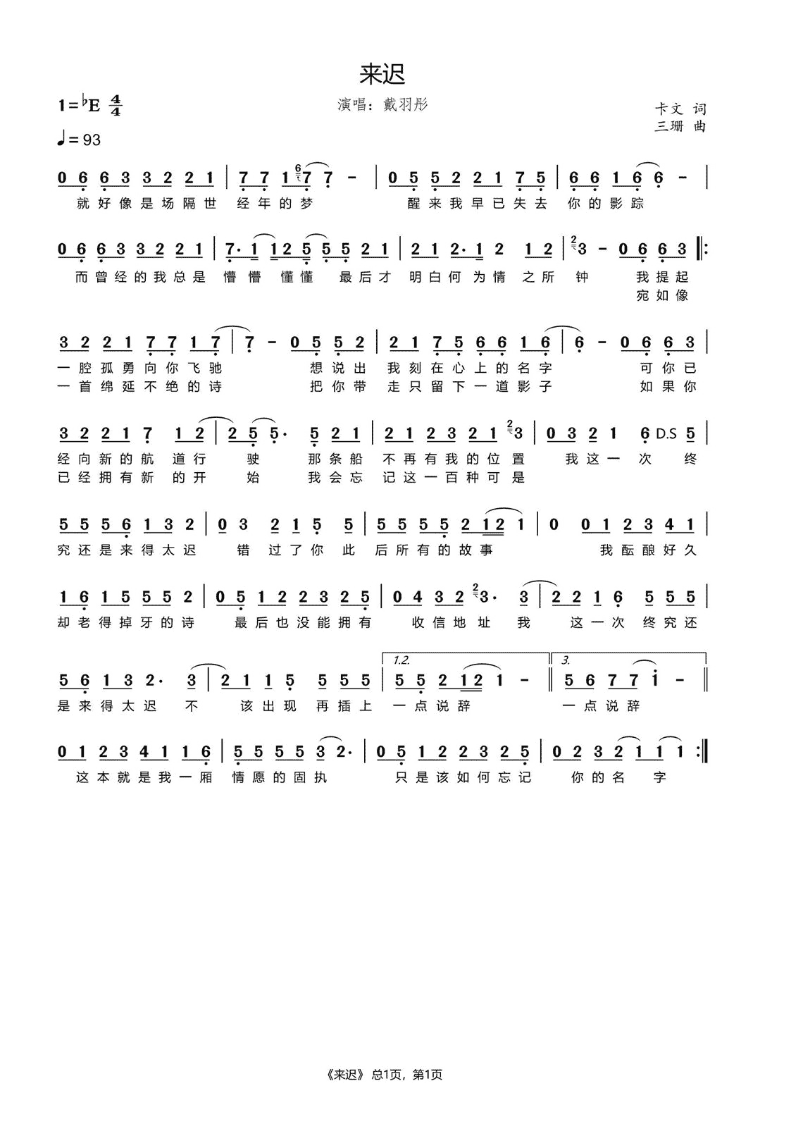 来迟- 戴羽彤钢琴谱-猫咪曲谱-虫虫钢琴