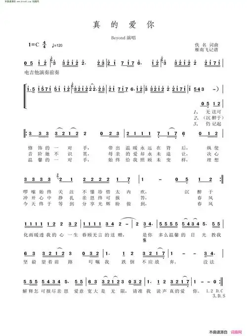 beyond真的爱你简谱,beyond真的爱你歌谱,beyond真的爱你歌词,曲谱