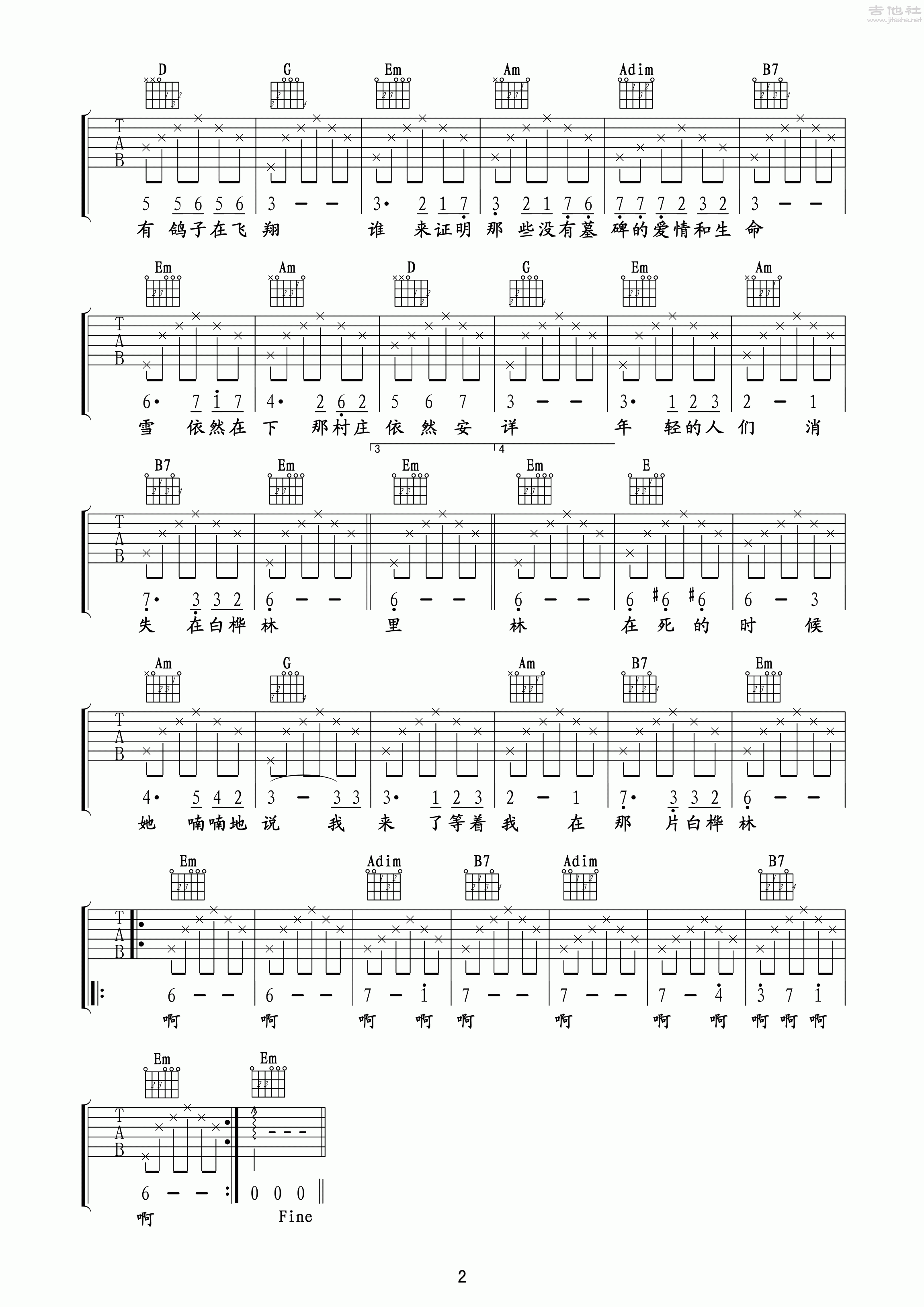 白桦林高清吉他六线谱吉他谱下载