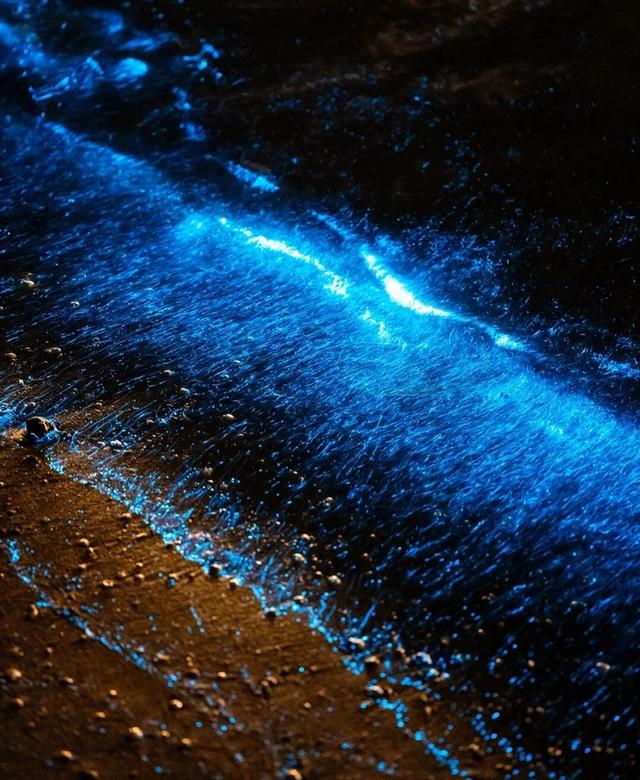 荧光随浪翻涌起舞,仿佛星河坠落凡间,这一景观也被称为"蓝眼泪"