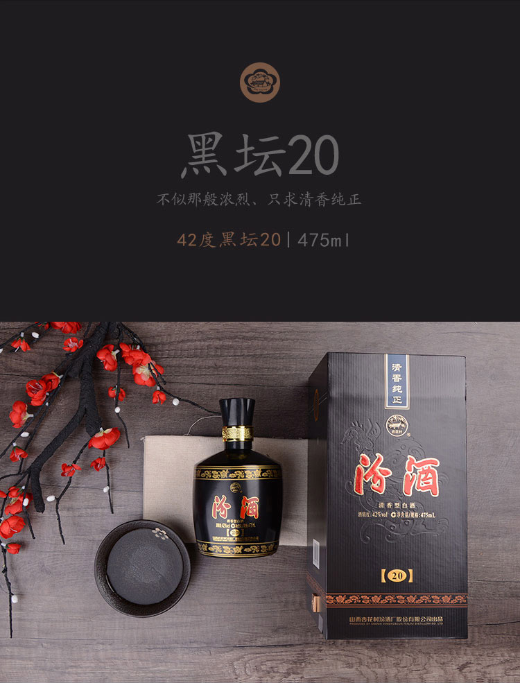 汾酒黑坛20年清香型白酒42度475ml单瓶装