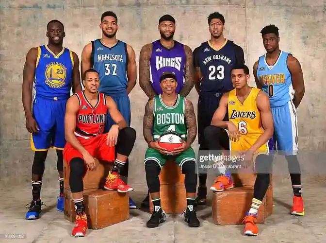 拍摄全家福时,杜兰特,麦基,阿德巴约站在后排中间,杜兰特的身高比