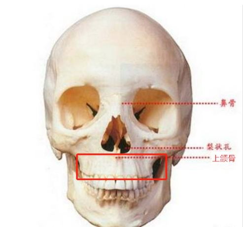梨状孔: 鼻骨(上)与 上颌骨额突(外) 及腭骨突起共同形 成梨状孔.