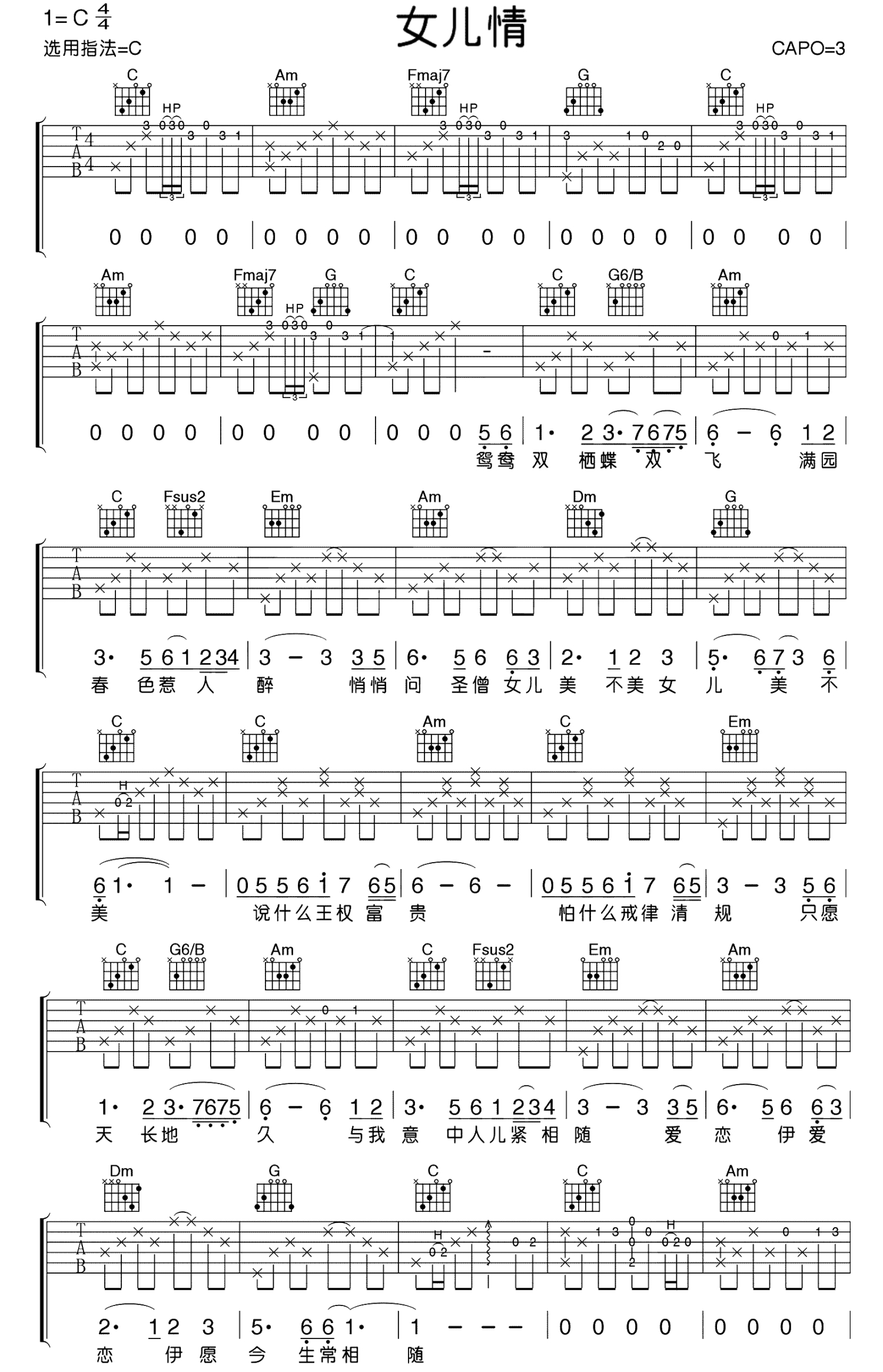 女儿情吉他谱c调吉他弹唱谱