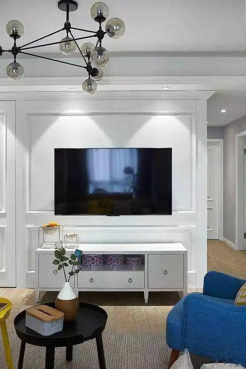电视墙走了圈石膏线,看起来简单素雅,灯饰也是比较有特色