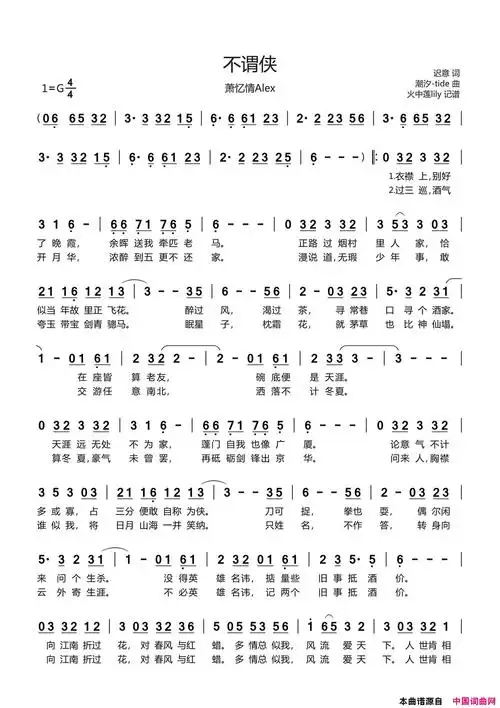 不谓侠简谱(歌词)_萧忆情alex演唱_谱友火中莲lily上传