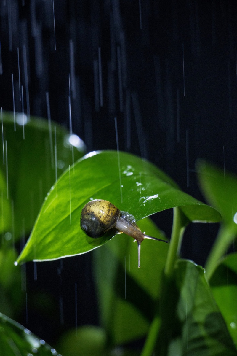 7415 雨中即景7415 漫步在雨中的小蜗牛 听着雨声,悠闲自得